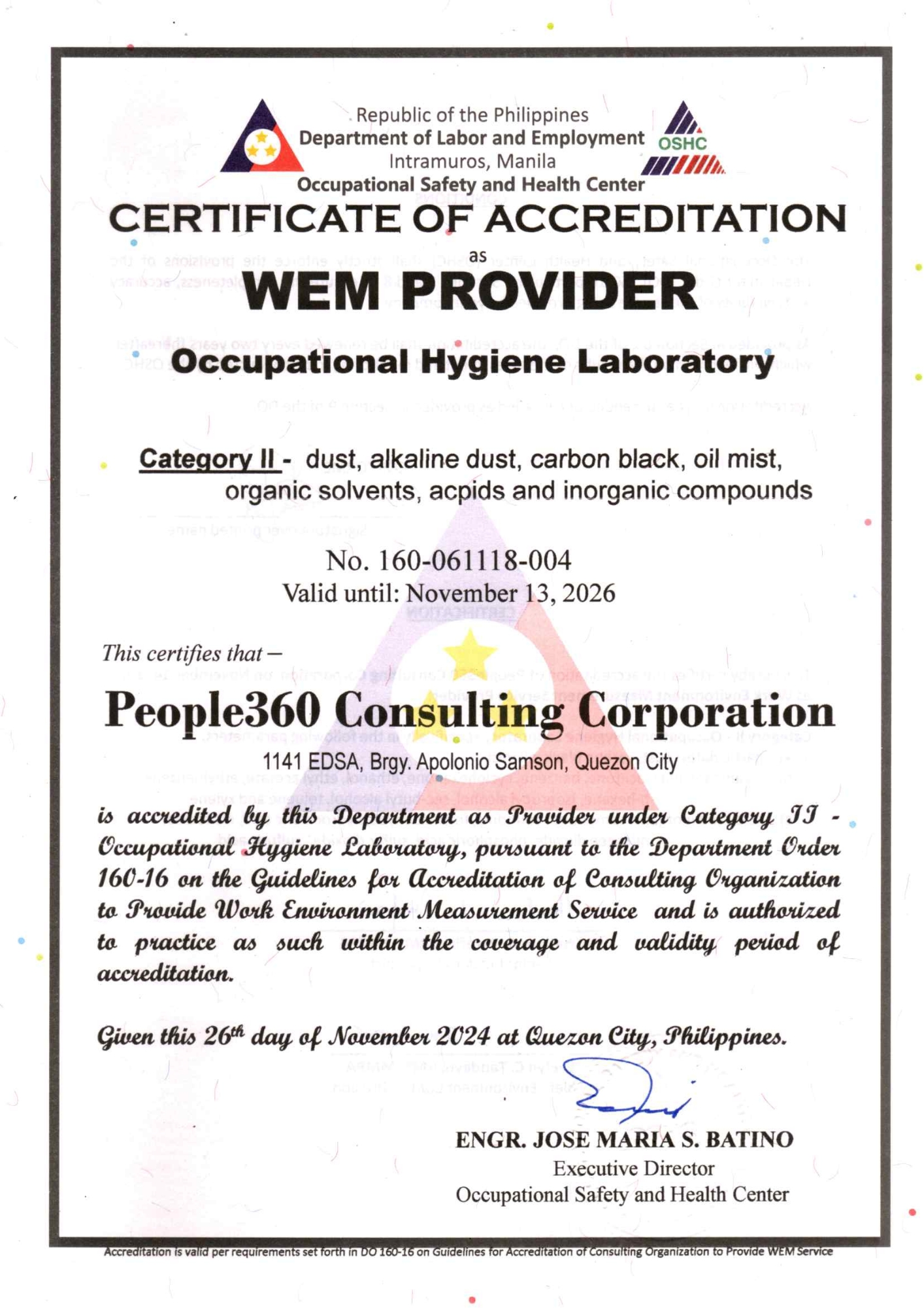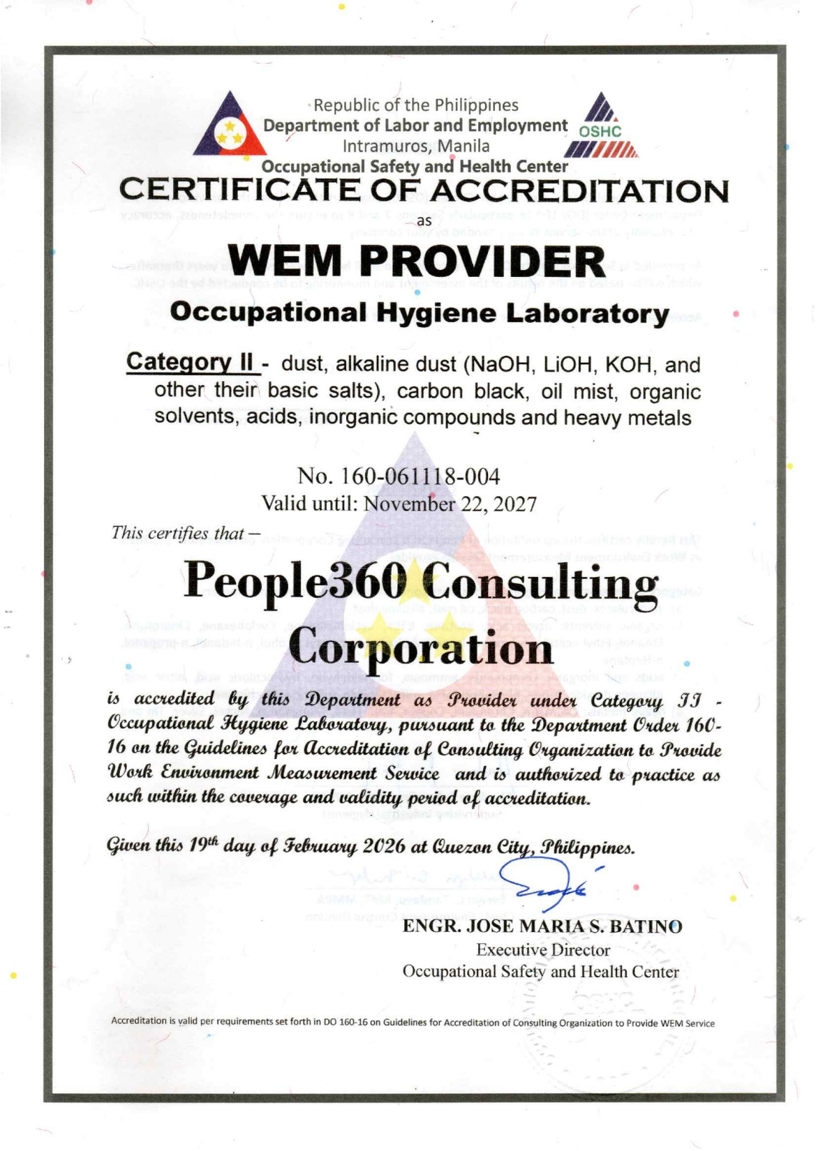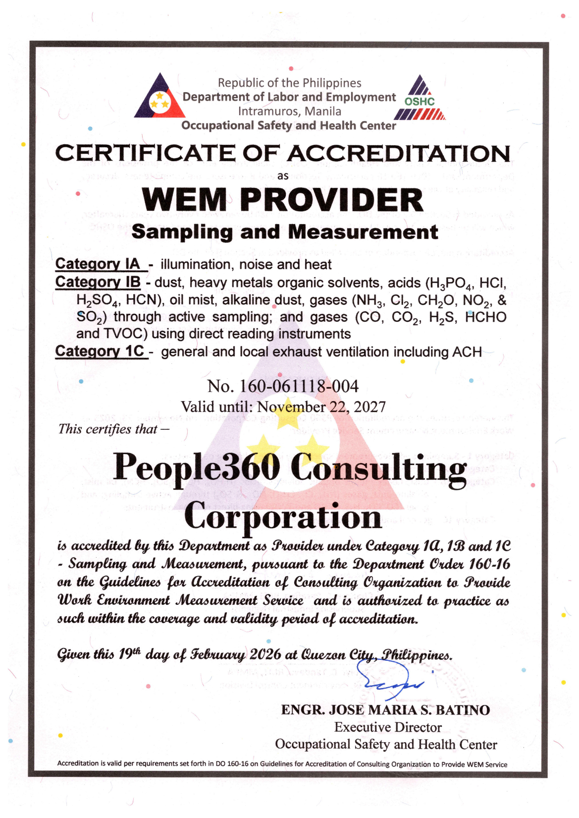 PEOPLE360 is the leading Safety Organization in the Philippines accredited by DOLE-OSHC to provide end-to-end solutions, namely Heavy Equipment Testing & Certification, Safety Consultancy, OSH Training, First Aid Training, Work Environment Measurement & Industrial Hygiene Laboratory (certified by the Professional Regulatory Board of Chemistry).