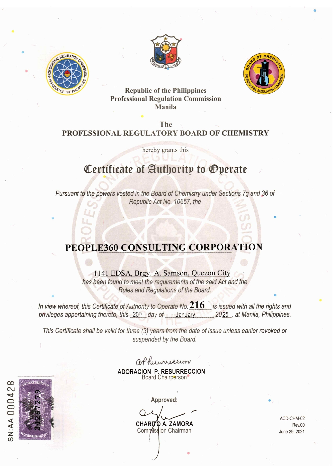 PEOPLE360 is the leading Safety Organization in the Philippines accredited by DOLE-OSHC to provide end-to-end solutions, namely Heavy Equipment Testing & Certification, Safety Consultancy, OSH Training, First Aid Training, Work Environment Measurement & Industrial Hygiene Laboratory (certified by the Professional Regulatory Board of Chemistry).